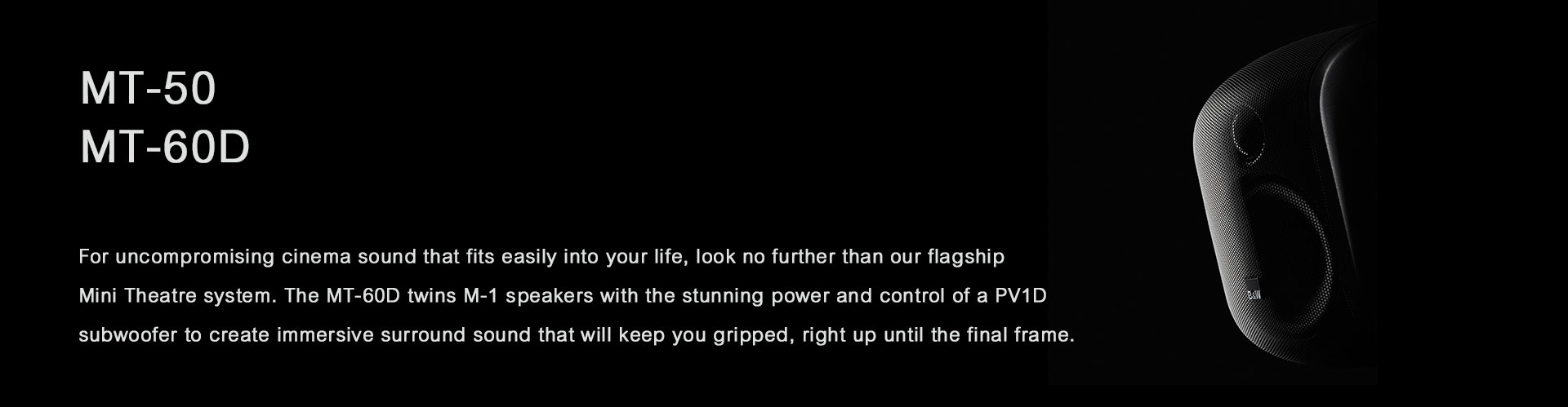 Big movie sound doesn’t necessarily require a blockbuster budget. Our entry-level MT-50 system delivers both great value and a truly immersive cinematic soundscape. This system swaps the PV1D for our compact but punchy ASW608 subwoofer, available in a choice of matt black and white finishes to match the M-1s.